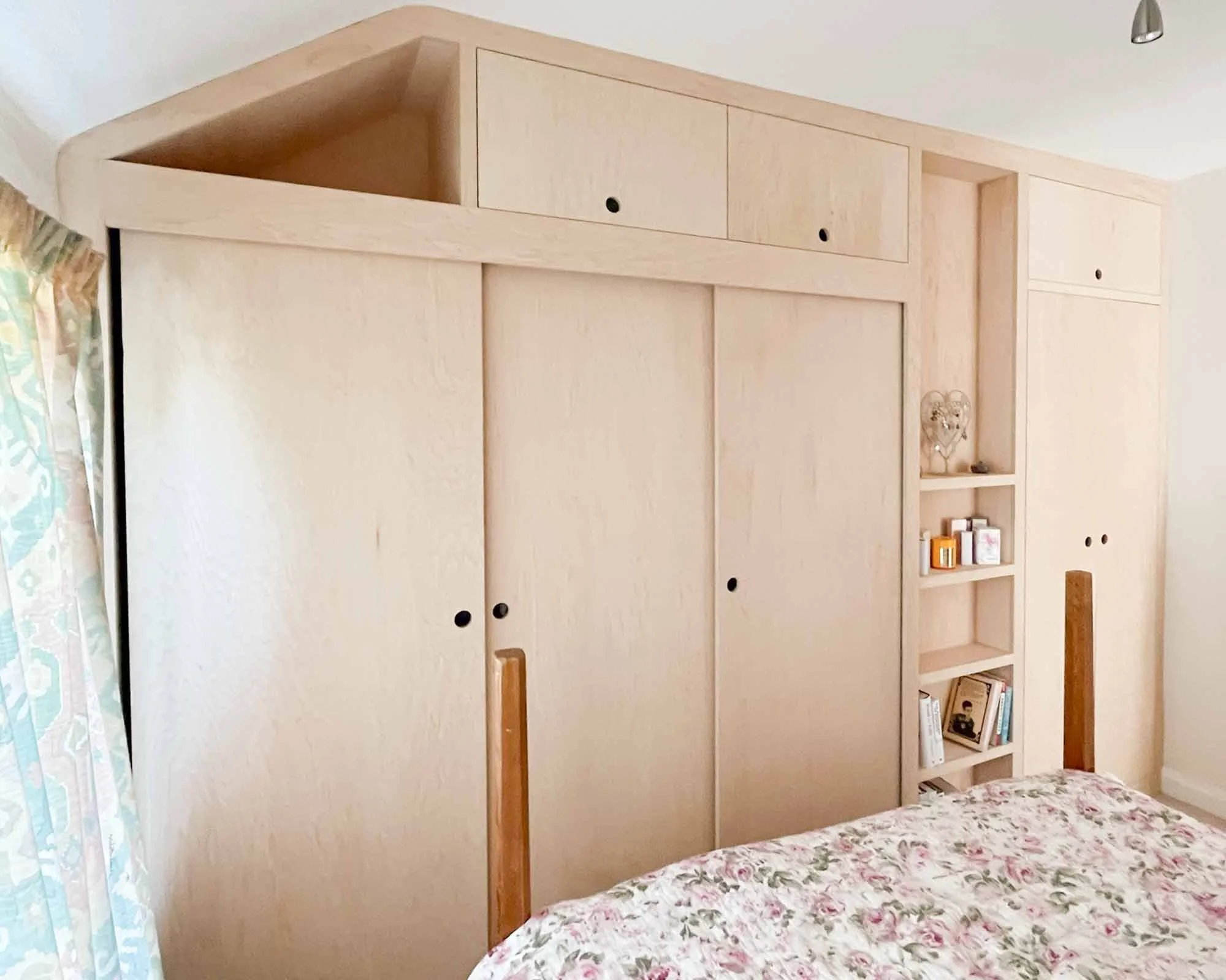 Many clients choose light timber finishes such as maple-faced plywood to create a calm and contemporary aesthetic. These natural materials bring warmth and texture to a bedroom while maintaining a clean, minimalist feel. Others may prefer painted finishes or more traditional styles depending on the character of the home.