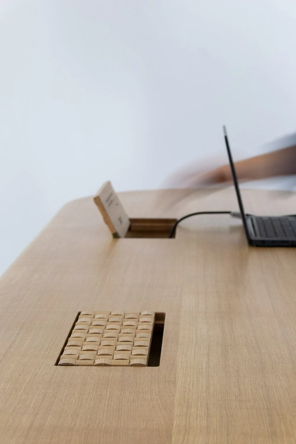 The table includes two ‘woven’ power-access panels. A design detail that adds texture and invites passing visitors to stop and engage with the piece.