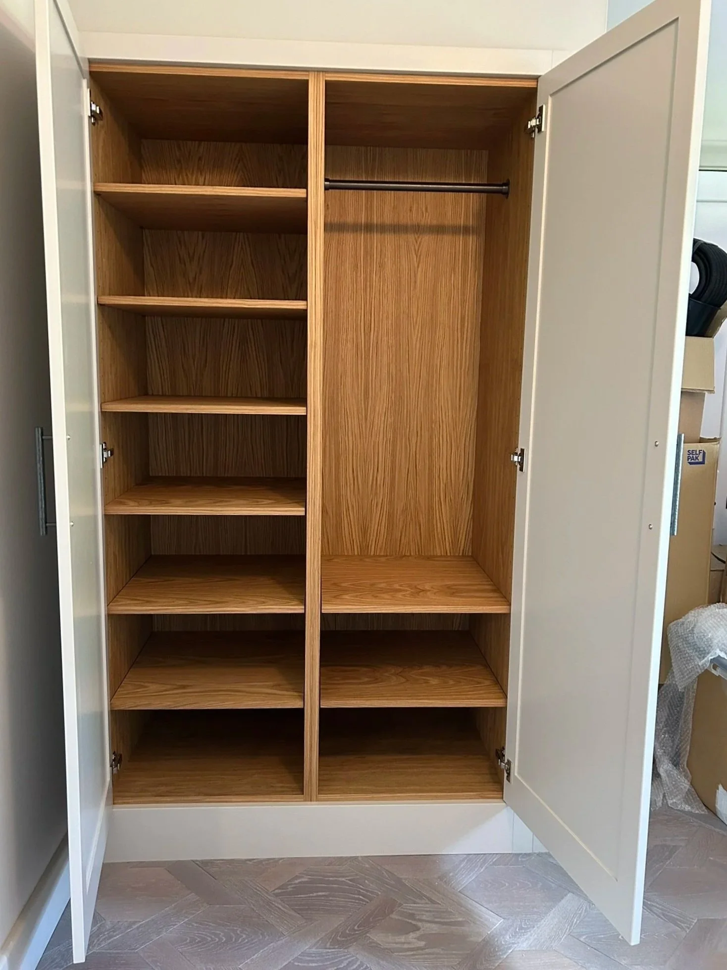 A custom cloakroom cabinet with shaker-style doors, an oak interior, and antique brass hardware - chosen to match fittings throughout the house - makes efficient use of an otherwise unused space. In the master bedroom, floating walnut shelves complement the cabinets on either side of the bed, with fluted detailing and push-to-open doors creating a clean, understated finish.